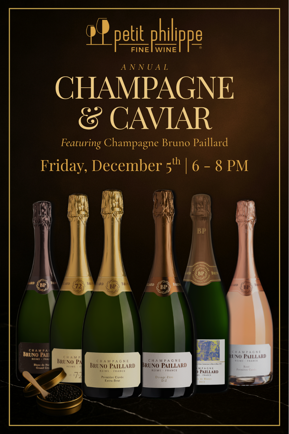 Celebrate the season at our signature year-end event featuring premium grower Champagne, artisan caviar pairings, and an elevated holiday atmosphere. An indulgent, unforgettable tasting for both enthusiasts and newcomers alike.